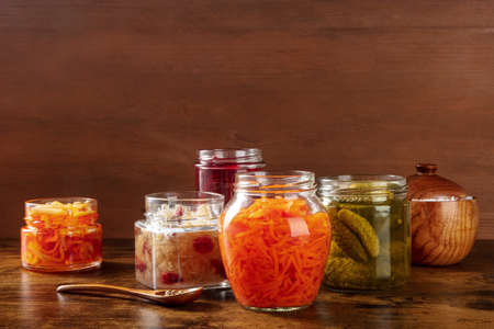 Fermented, probiotic food. Canned vegetables. Pickled carrot, sauerkraut and other organic preserves in mason jars. Healthy vegan cooking concept with a place for text
