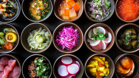 A vibrant display of assorted pickled vegetables and sauces in small ceramic bowls, showing a variety of colors and textures, perfect for culinary exploration.