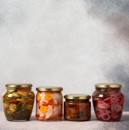 Fermented preserved food. Marinated pickles vegetables in glass jars with copy space