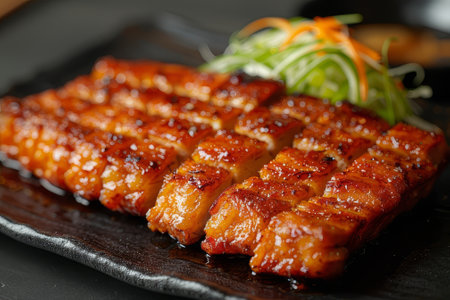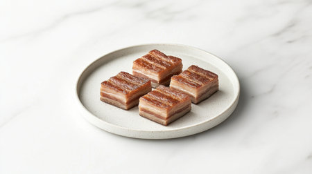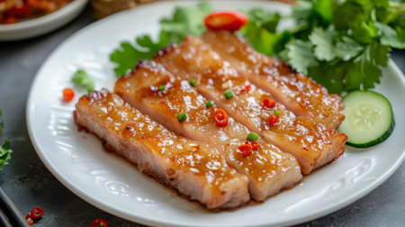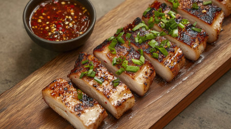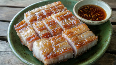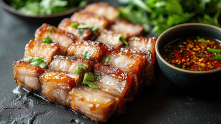 Indulge in the rich flavors of beautifully cooked crispy pork belly slices, perfectly plated with a tangy dipping sauce that enhances any culinary experience.