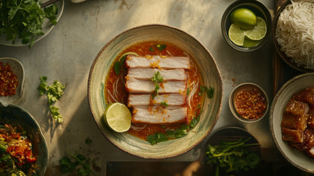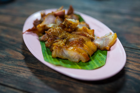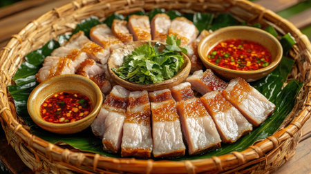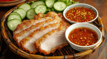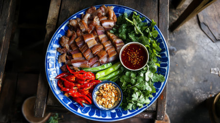 A vibrant and colorful arrangement of fried pork belly with fish sauce, displayed on a traditional Thai plate, capturing the essence of authentic cuisine