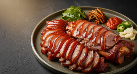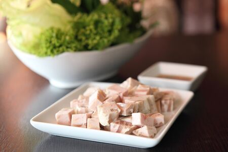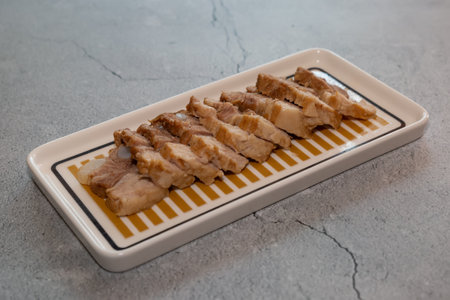 Sliced boiled pork belly on plate, asian style food