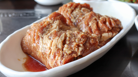 Bossam and kimchi in a ceramic bowl. Pork dishes that are popular with Koreans.