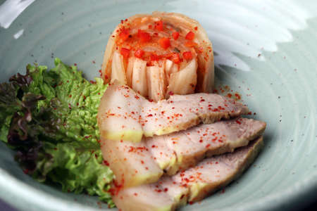 Korean cuisine Suyuk - boiled pork slices with chives on porcelain bowl and side dish