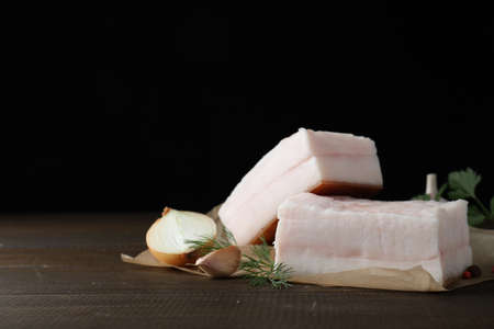 Tasty salt pork with herbs, onion and garlic on wooden table, space for text