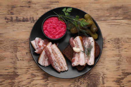 Pork fatback with rye bread and ingredients on wooden table, top view