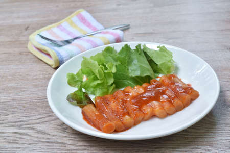 Stir-fried spicy and sweet fish cake. Stir-fried dishes in red seasoning. Fish cake and vegetables