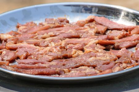closeup sun dried meat in metal plate home made.