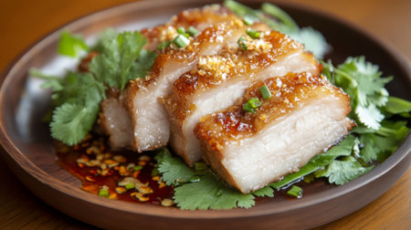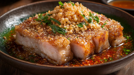A beautifully plated dish of crispy pork belly, glistening with a drizzle of fish sauce, garnished with fresh herbs and served with a side of spicy dipping sauce.