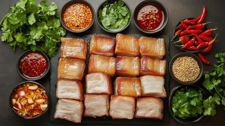 A delightful flat lay of fried pork belly with a variety of dipping sauces, fresh herbs, and chili peppers, creating an appetizing and colorful food spread