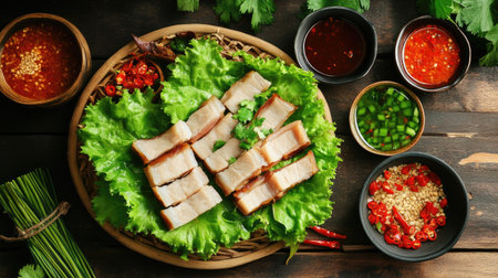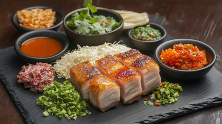 A stunning display of crispy pork belly served with fresh herbs, vibrant sauces, and assorted vegetables, perfect for food enthusiasts or restaurant menus.