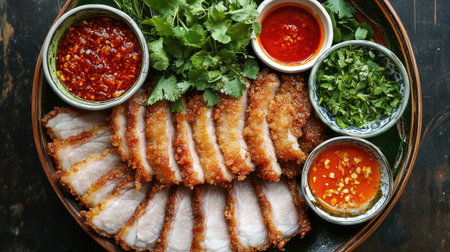 A vibrant platter featuring crispy pork slices accompanied by an array of colorful sauces and fresh herbs, perfect for any culinary setting.