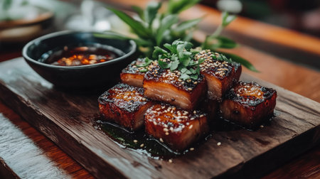 A beautifully presented dish of caramelized pork belly garnished with fresh herbs and sesame, served on a wooden board with dipping sauce.