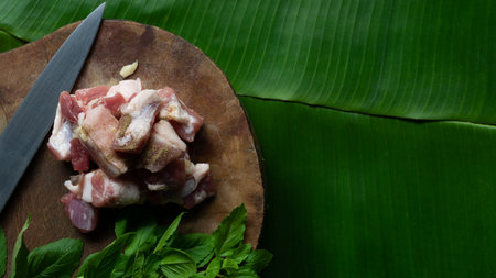 Seasoned sliced ​​pork ready for cooking on green banana leaf background.