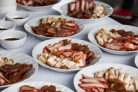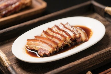 Oriental roast pork belly or char siew on white plate