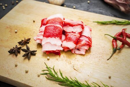 Raw pork belly portions, Marinated rolled pork belly ready for roasting. Selective focus.