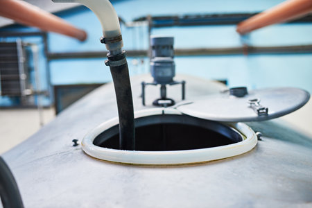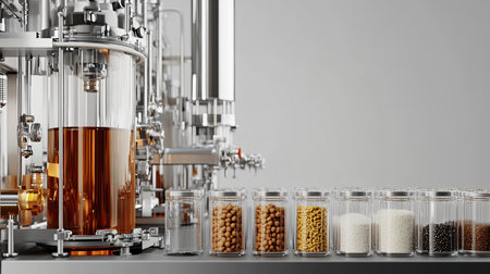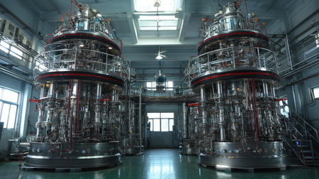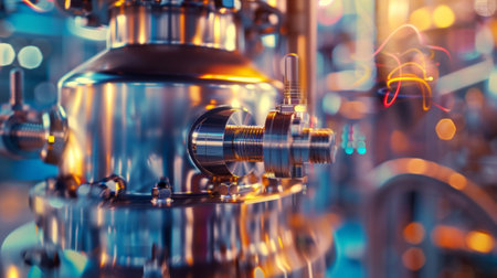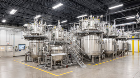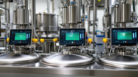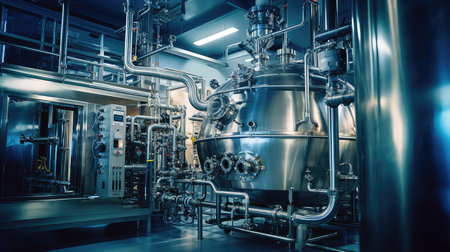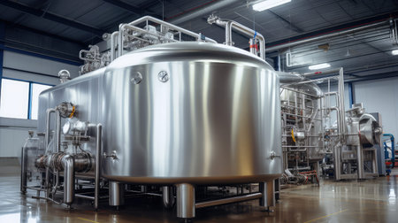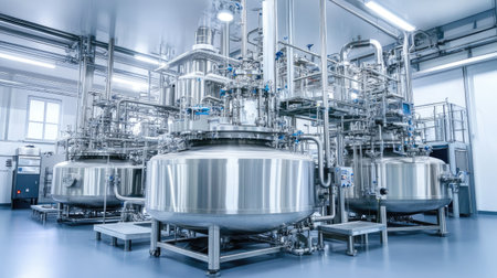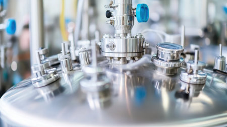 This image captures modern laboratory equipment featuring stainless steel tanks and precise instruments, ideal for showcasing technology in scientific research and industrial processes.