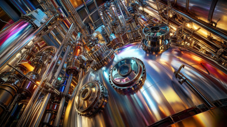 This captivating image showcases a complex arrangement of industrial machinery reflecting vibrant colors. The intricate details reveal a modern manufacturing environment with high-tech equipment and metallic surfaces.
