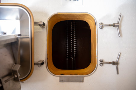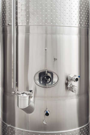 Close-up image of modern stainless steel barrel for wine fermentation at a winery. Wine industry.