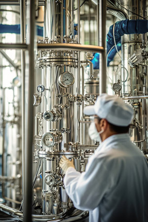 Modern industrial facility with professional technician overseeing advanced processing equipment and large stainless steel tank.