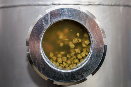 Brewery fermentation tank filled with hops in process.
