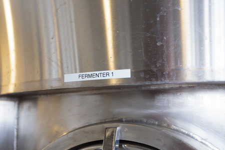 Label reads fermenter 1 at a brewery on stainless steel.