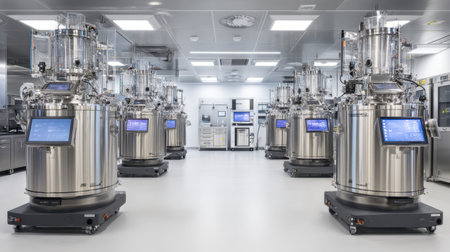This modern laboratory showcases industrial bioreactors designed for biopharmaceutical and biotechnology research, emphasizing sterile processing and advanced technology.