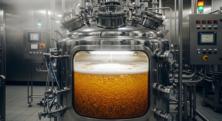 A large, shiny stainless steel bioreactor or fermentation tank in a modern industrial facility, possibly a brewery or pharmaceutical plant. Through a large viewing window, a golden, bubbling liquid, likely beer, is being actively fermented under bright light. This image represents the process of brewing, biotechnology, and modern industrial production.