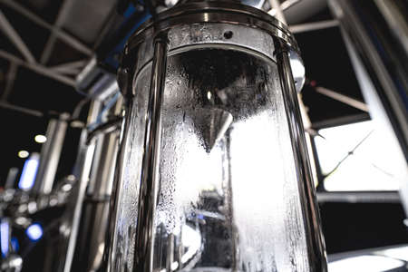 Motion blurred close-up a full working brewery hops of local restaurant near Dallas, Texas. Row of shiny tanks fermented of standard beer styles and seasonal brews