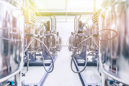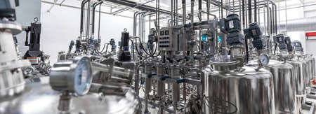 Panoramic photo of pipes and tanks. Chemistry and medicine production. Pharmaceutical factory. Interior of a high-tech factory, modern production