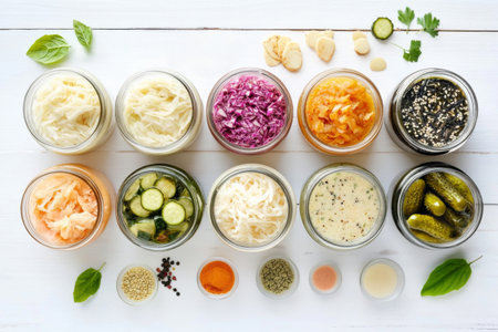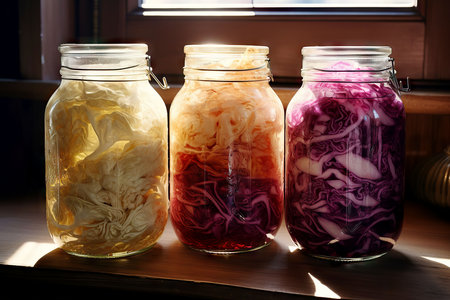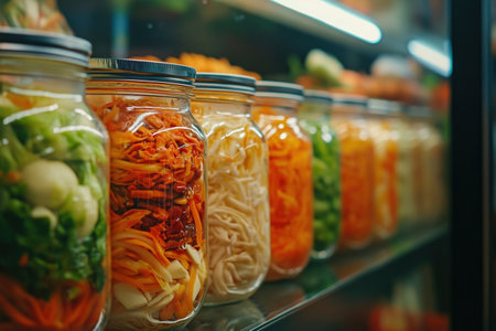 Vibrant jars of fermented vegetables on display for culinary inspiration.