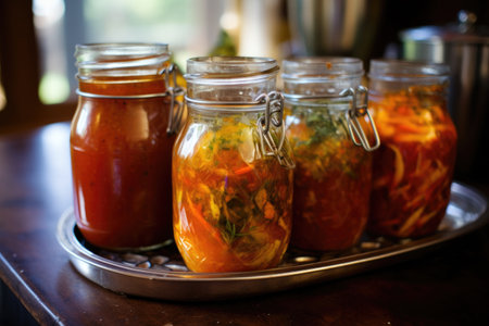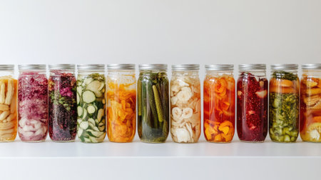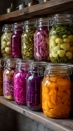 A visually appealing arrangement of jars filled with preserved vegetables, showcasing vibrant colors and textures, perfect for culinary inspiration in any home kitchen setting.