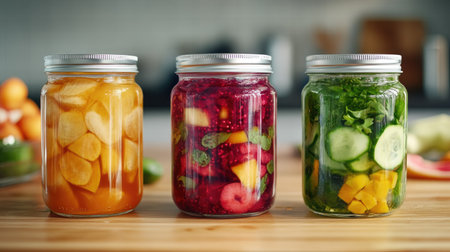 Close-up of jars containing vibrant fruity jams, compotes, and pickled vegetables, placed on a wooden countertop, showing the process of fruit preservation.