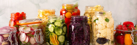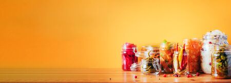 Fermented food panorama. Canned vegetables. Pickles, sour cabbage and other marinated preserves in glass jars. Healthy vegan cooking panoramic banner