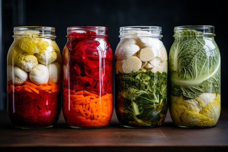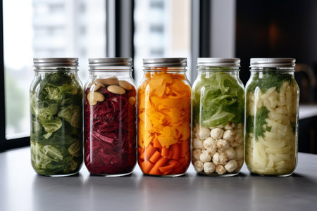 glass jar filled with various fermented vegetables, each with its own unique flavor, created with generative ai