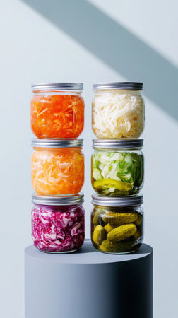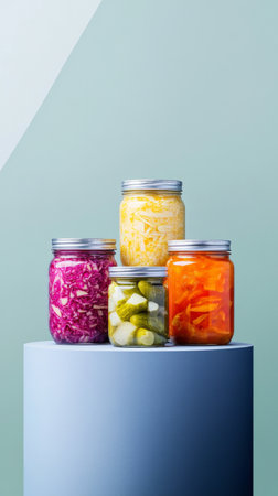Colorful fermented foods in jars on a minimalist pedestal. Bright hues of kimchi, sauerkraut, and pickles pop in this modern, health-focused scene.