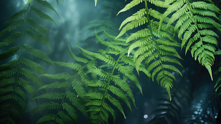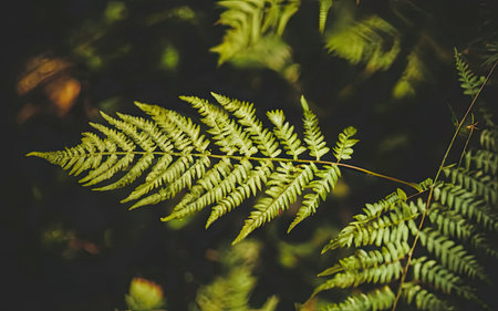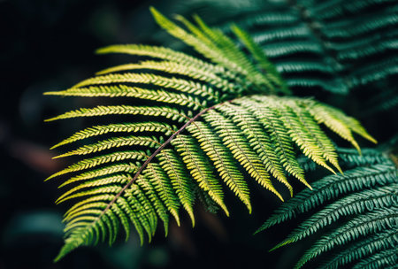 Close-up captures vibrant green fern fronds against a dark, blurred backdrop