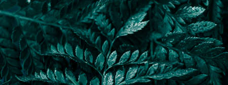 Dark green fern texture background looks like cosmic jungle. Soft focus to unusual vibrant deep emerald color exotic plants. Abstract tropical backdrop of rainforest foliage textures for creative use