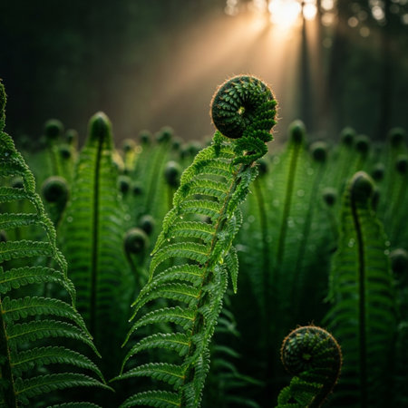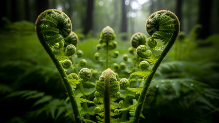 Vibrant green fern fiddleheads unfurl in a mystical forest, showcasing intricate natural patterns and soft, diffused light.