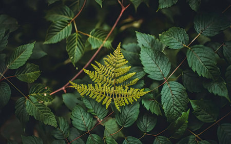 Tropical green leaf with a dark shade. in the shade of a forest fern. the background is blurred. minimum focus point
