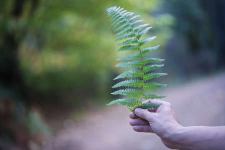 A women hand with green fern leaf in the forest