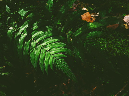 Wild fern leaf moody photo in dark tone. Tropical garden minimalist abstraction. Summer foliage toned photography. Green forest detail. Exotic floral template. Vintage garden card. Blooming nature