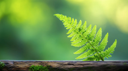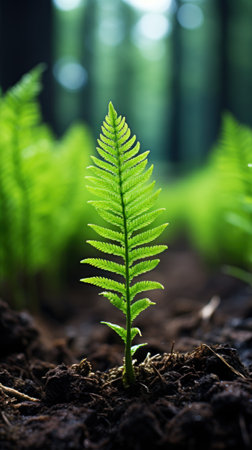 A lone fern stands tall in a sunlit forest, surrounded by lush greenery. Enjoy the tranquil atmosphere and vibrant hues of nature in this serene landscape.