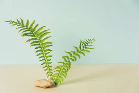 Podium made of natural materials: stone and fern for the presentation of cosmetic products. Background with green plants. Copy space, front view