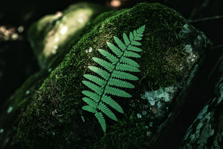 A vibrant green fern frond rests delicately on a moss-covered rock, showcasing the beauty of nature's details in a lush forest setting.