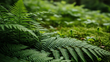 Detailed view of lush green moss and fern leaves on a forest floor with soft natural light filtering through the dense foliage.
