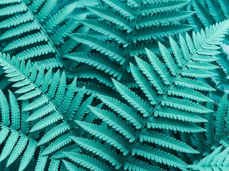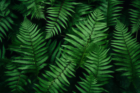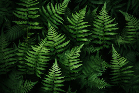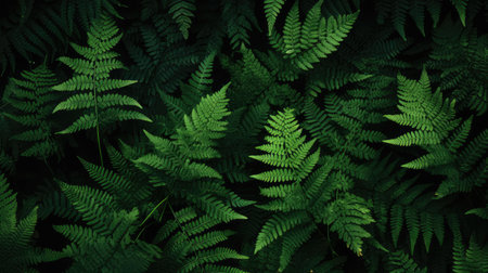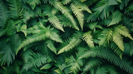 Exotic fern leaves arranged in layers in a dense, rich green pattern, tropical rainforest botanical background. generative ai