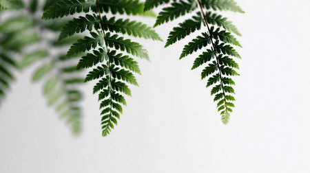 Close up of green fern leaves on a white background with copy space