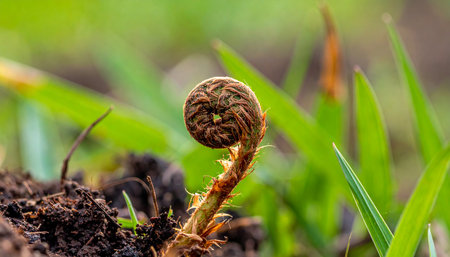 A detailed close-up of a brown fern fiddlehead unfurling from the soil, with green grass blades visible.