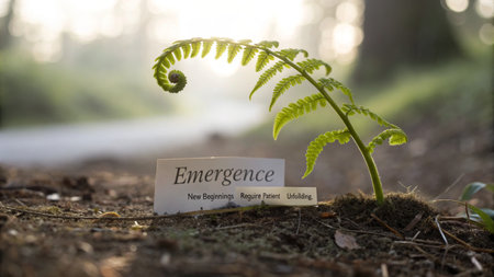 A young fern unfurls its delicate frond in the soft morning light, with 'Emergence' and 'New Beginnings Require Patience' printed on cards nearby, representing hope and the journey of growth, perfect for inspiring new starts.